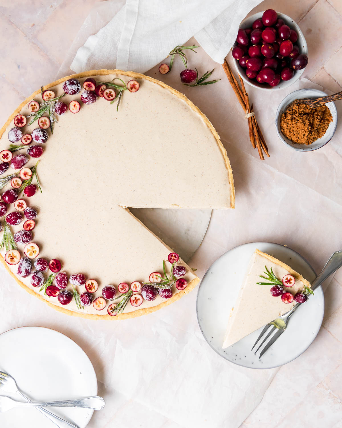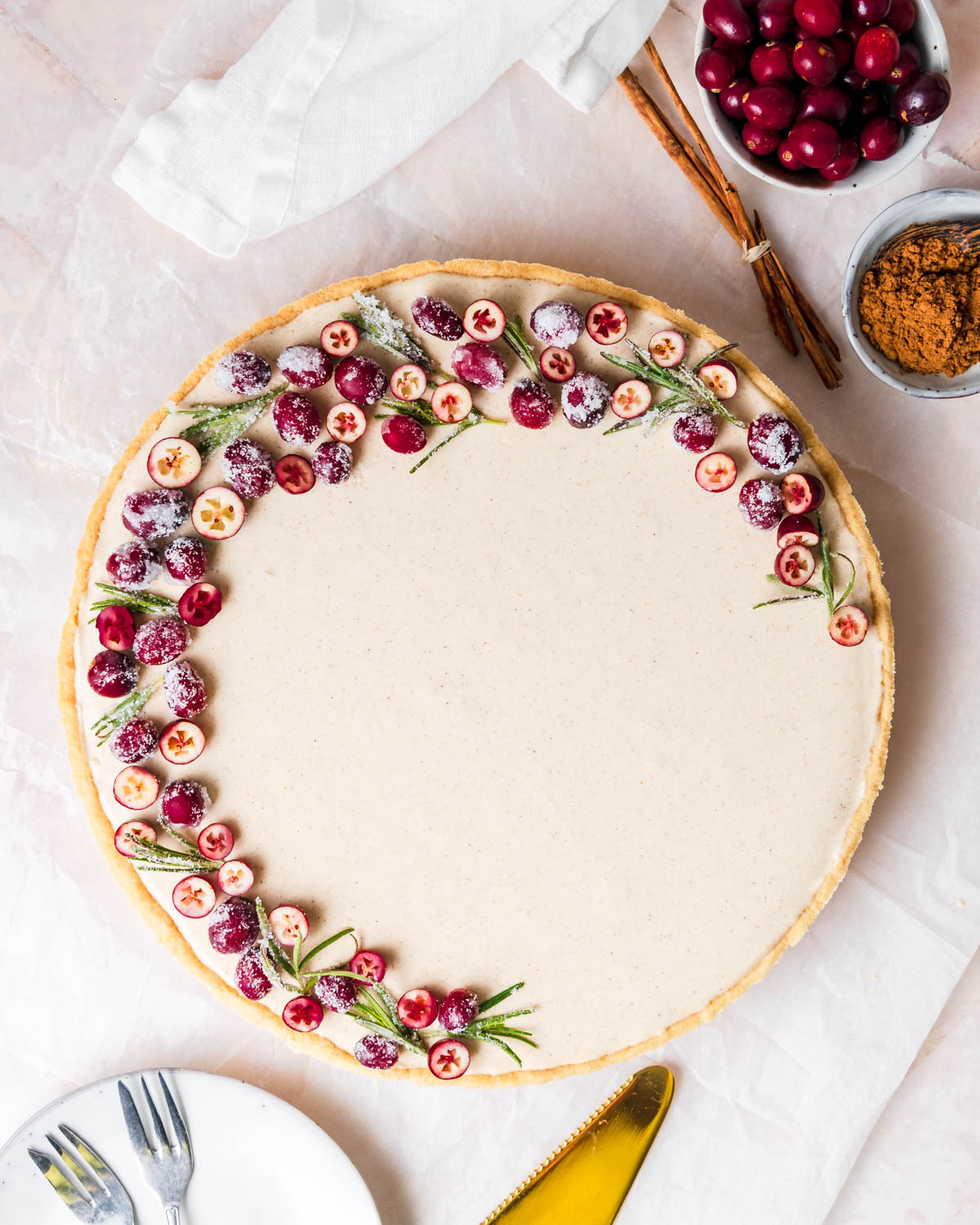 4. SCHRITT: Tarte verzieren. Bring 1 EL Wasser mit 1 EL Xylit oder Erythrit+Stevia zum Kochen. Schwenke Cranberries und Rosmarin darin für 3-5 Minuten. Dann auf einen Teller geben und 5 Minuten auskühlen lassen. Gib nun 1 EL Xylit oder Erythrit+Stevia in eine Schale und schwenke Cranberries und Rosmarin darin, dass sie schön eingestäubt sind. Dekoriere damit nach Belieben deine Tarte.