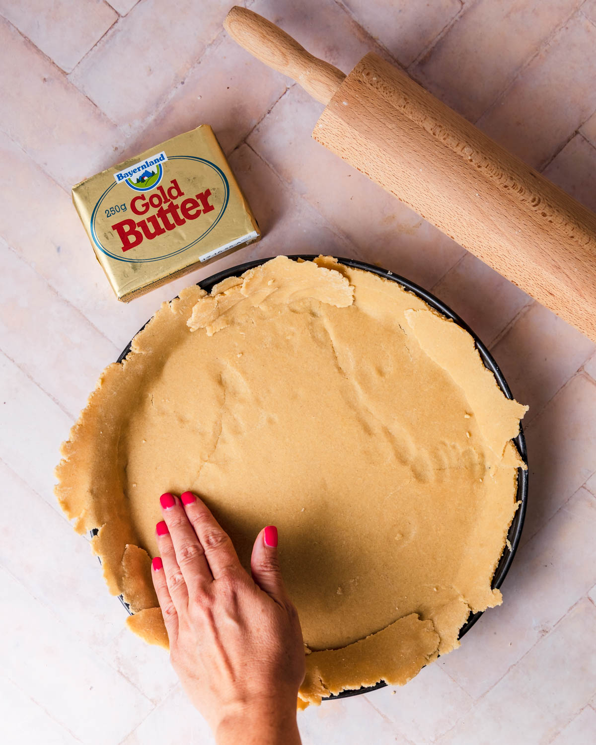 - Die Tarteform mit Backtrennspray einfetten und den Teig gleichmäßig hineindrücken